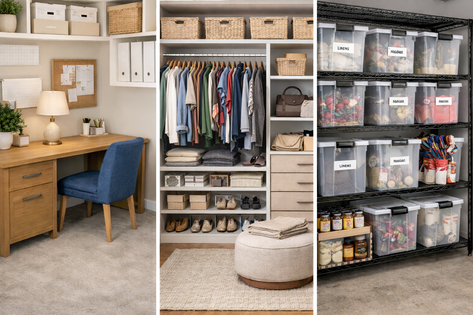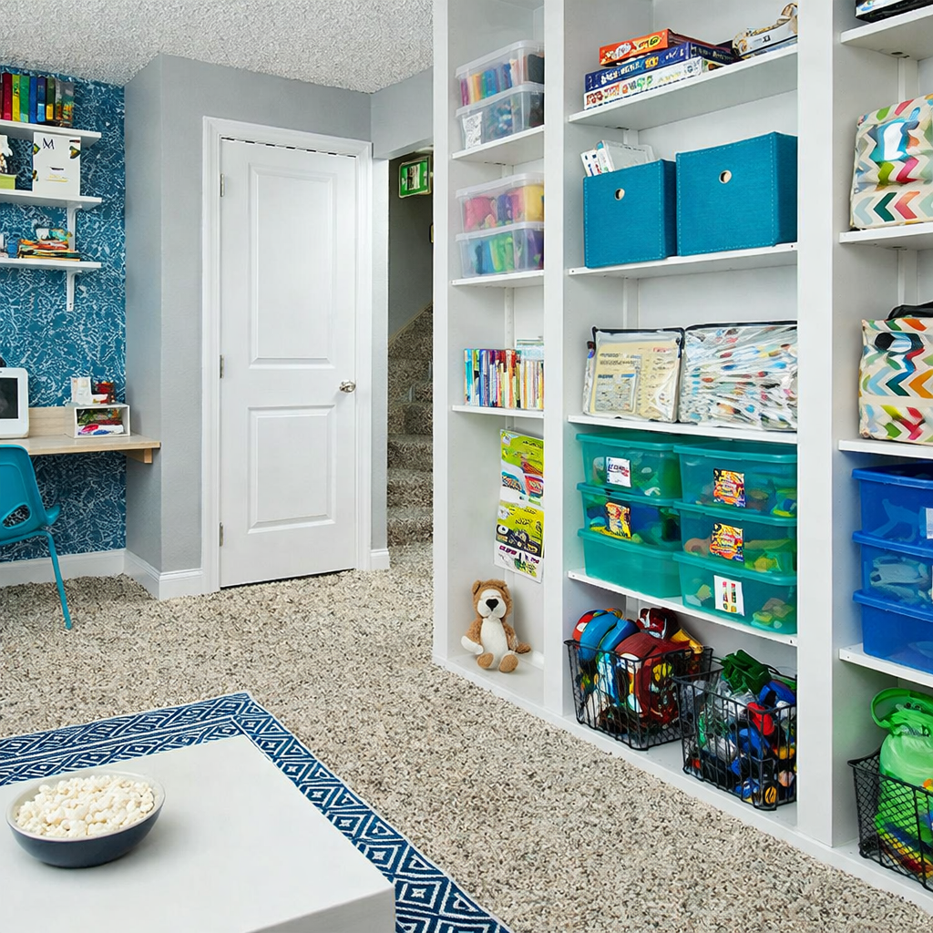We group like items together and create intuitive zones that align with daily routines. Supplies live near the task. Tools stay near the action.